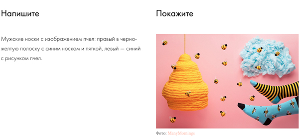 Если вы продаете шведские разноцветные носки, одна фотография расскажет об их красоте больше, чем страница текста. Подкрепляйте текст иллюстрациями, или даже заменяйте текст фотографиями.